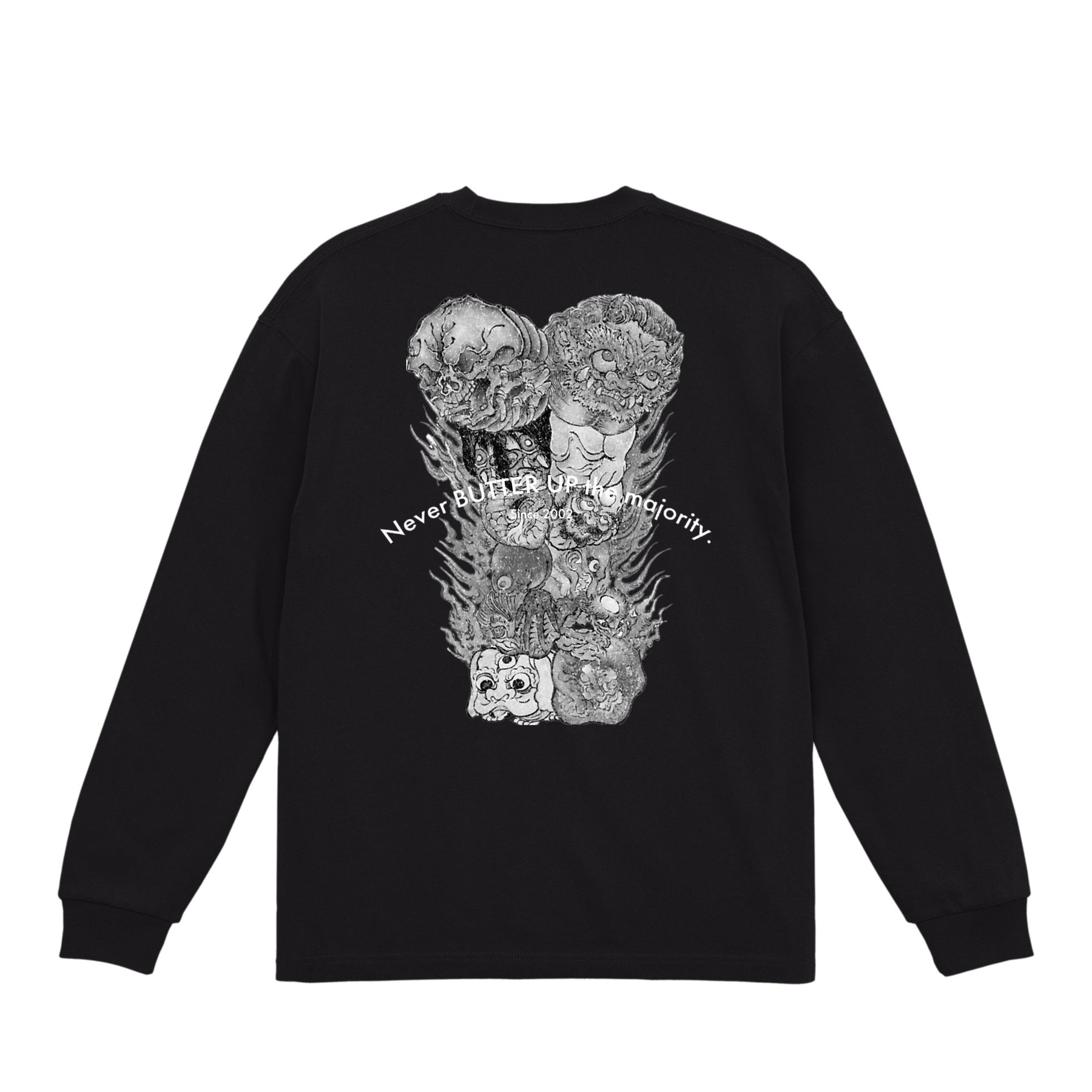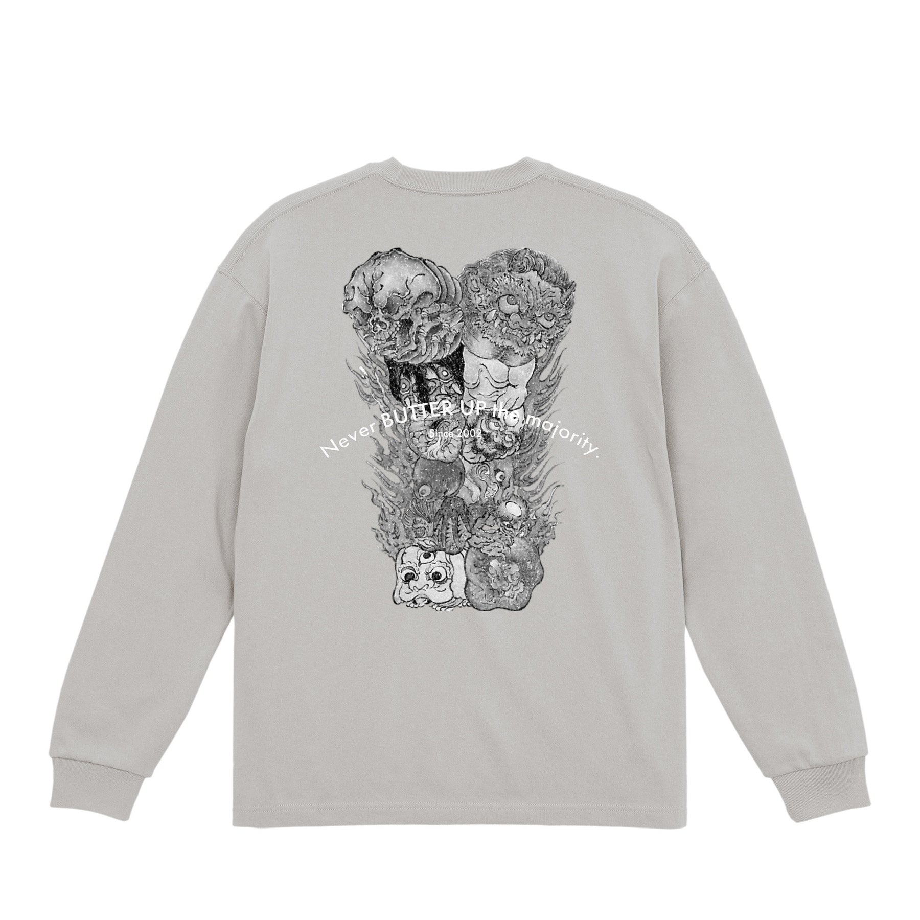 フロントには刺繍でグロコン・エイトのoctagonを刺繍、バックには妖怪とnever BUTTER majorityをプリント。生地はステッチワークなど、ヴィンテージライクな仕様にレイドバック感のある袖など、新たな魅力が光る一枚。 シャリ感のある超極厚生地と、大きく着ても余計に絶妙に調節されたサイズ感が、コーディネートを楽しんでいただける1着です。 オープンエンド糸で編みたてられた生地は着こむほどに独特の味わいを醸し出し、エイジング(経年変化)を是非楽しんでください。